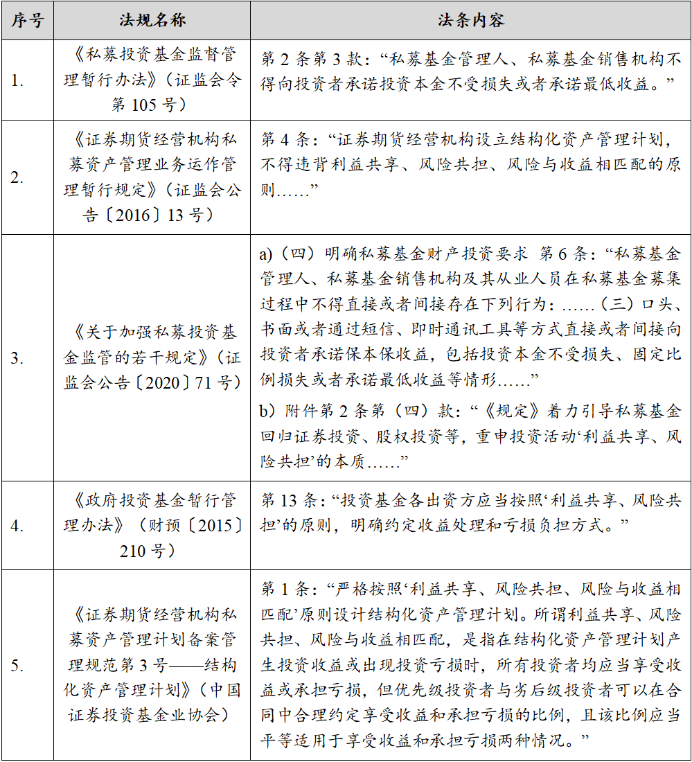 上述提及的私募基金管理人等相关主体的法定义务实际上体现了私募基金领域“收益风险、风险共担”的原则,该原则作为“投资”这一本质的体现,从以下规定中得到了不同程度的体现: