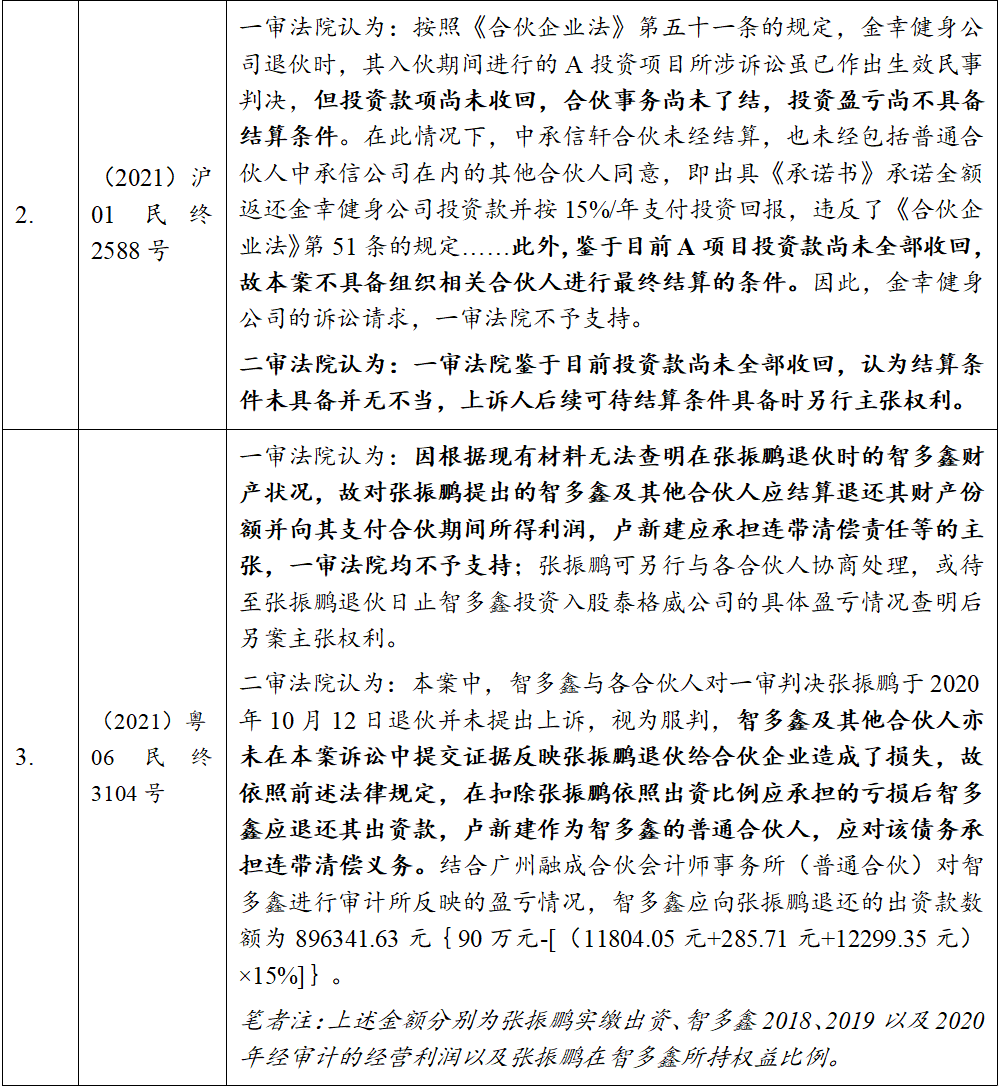 除运用法律解释方法外,笔者也为此检索了相关司法判例。从典型案例来看,退伙时私募基金尚未退出投资项目是否导致无法进行结算与退还财产份额,也须根据不同情况进行判断,具体考量因素包括投资项目盈利情况、全体合伙人是否均已同意结算价款与退还方式、私募基金是否已就投资退出达成协议文件或存在其它待履行的权利义务等。