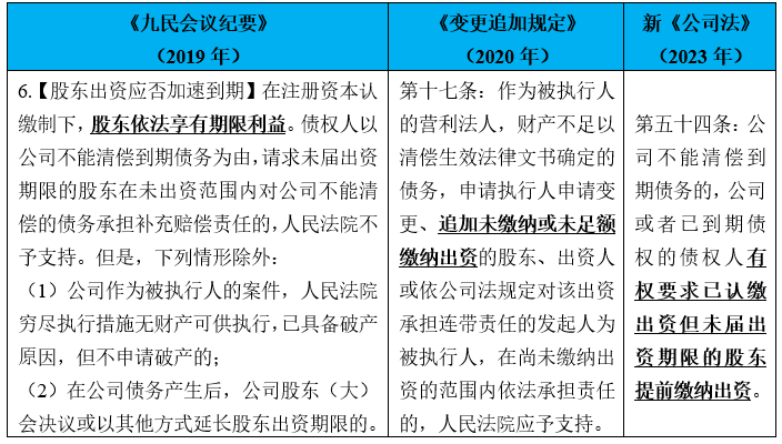 (3)新《公司法》明显转向,在公司不能清偿债务的情况下,债权人或者公司可以要求认缴期限尚未届满的股东提前出资。