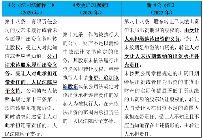 该规定正式施行后,势必导致股权的转让方更为审慎考察受让方的资信能力。此处同样需要注意的是,《变更追加规定》的现行规则与新《公司法》的规定尚未匹配,故目前尚不能直接依据新《公司法》的规定在出资期限尚未届满的情形下追加被执行人、亦不能追加股权转让的受让方为被执行人。