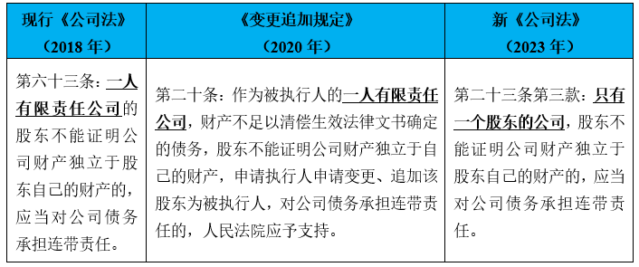 而新《公司法》第二十三条不但将措辞从原来的“一人有限责任公司”修改为“只有一个股东的公司”,而且第23条的章节位置也调整为第二章“公司登记”,可统摄第三章的“有限责任公司”和第七章的“国家出资公司”,并且财产独立的证明责任在于“股东”。因此后续国有独资公司也存在因一人股东财产混同而被追加为被执行人的风险。