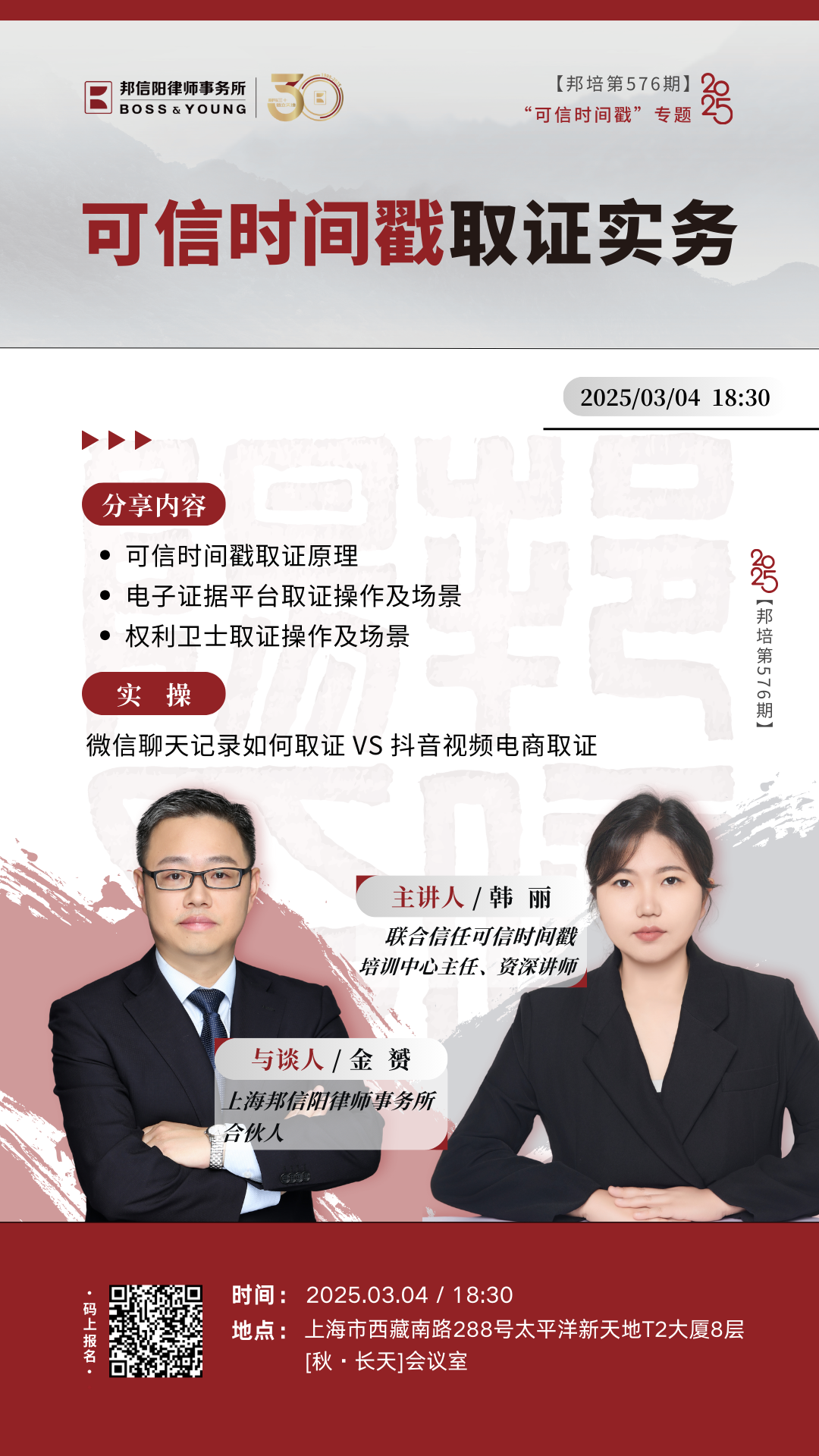 【邦培第576期:可信时间戳取证实务】3月4日下午18:30在上海邦信阳律师事务所线下举行。