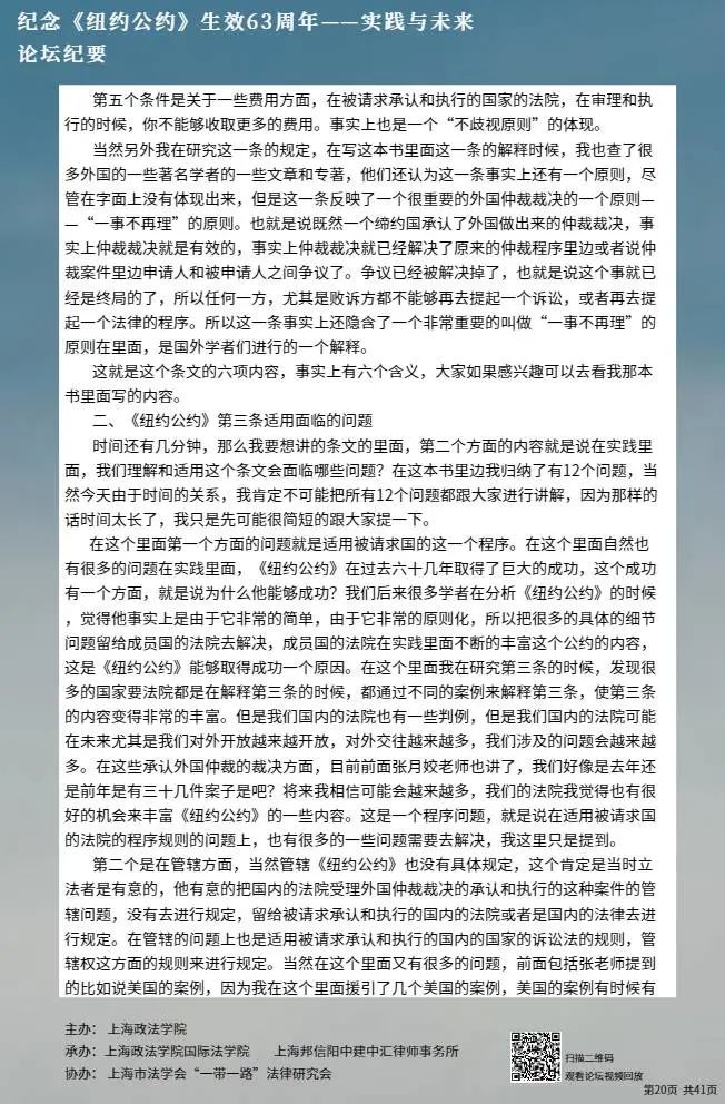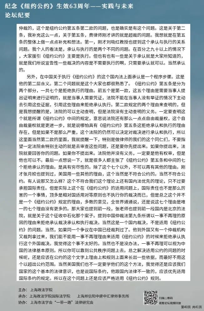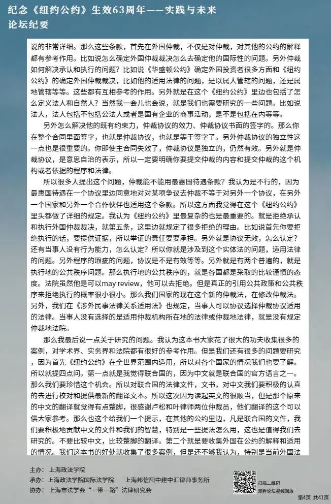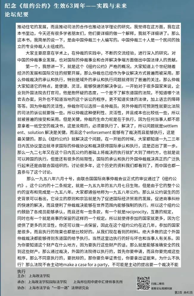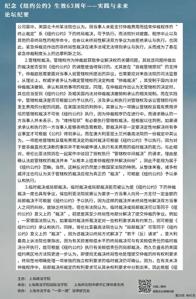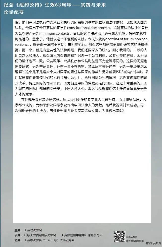 本次论坛集中国内知名专家学者的智慧,就《纽约公约》的实践与未来进行学术探讨,围绕《纽约公约》在中国的实践、拒绝承认与执行仲裁裁决的理由、仲裁协议的效力等问题分享真知灼见,有利于加强我国知名专家学者的互动交流,促进一系列重大国际法理论与实践问题的深入探讨,为国际商事仲裁的发展贡献中国智慧。