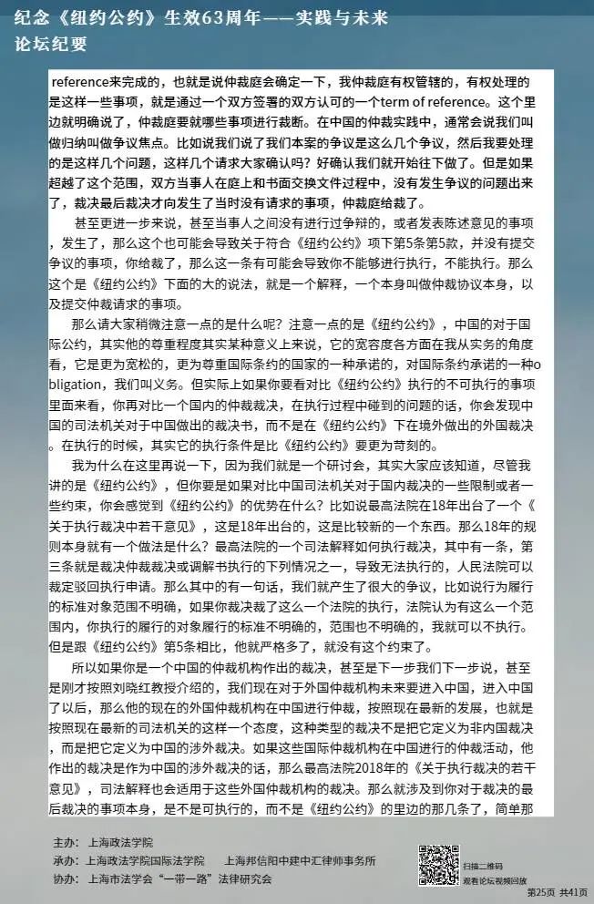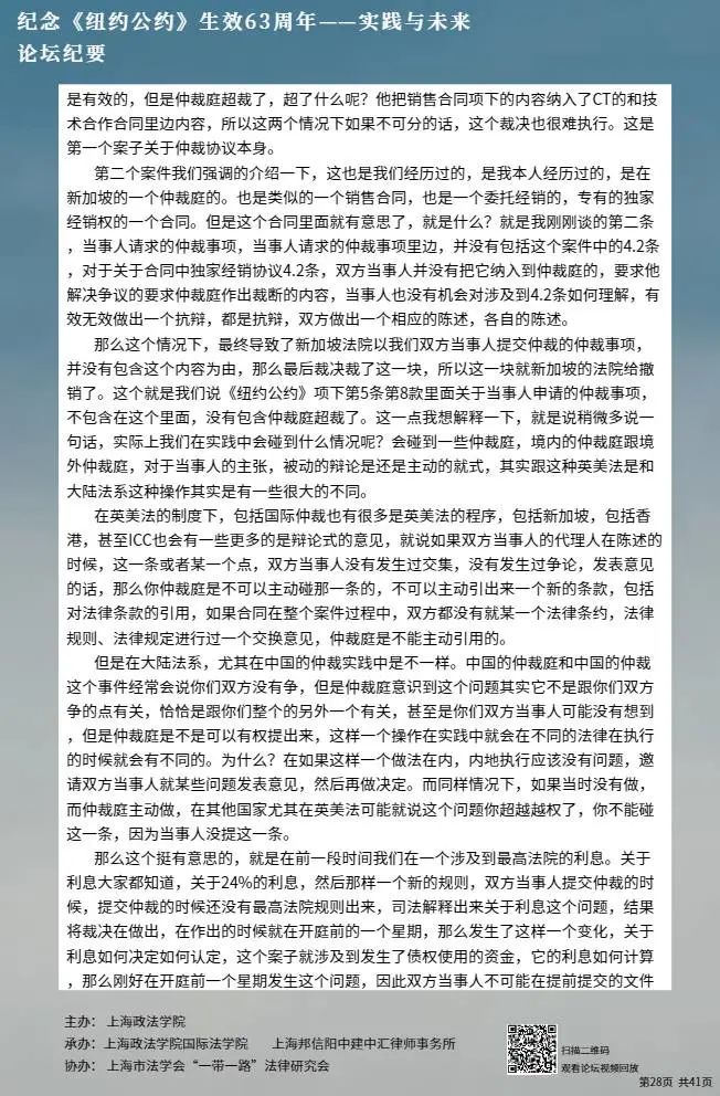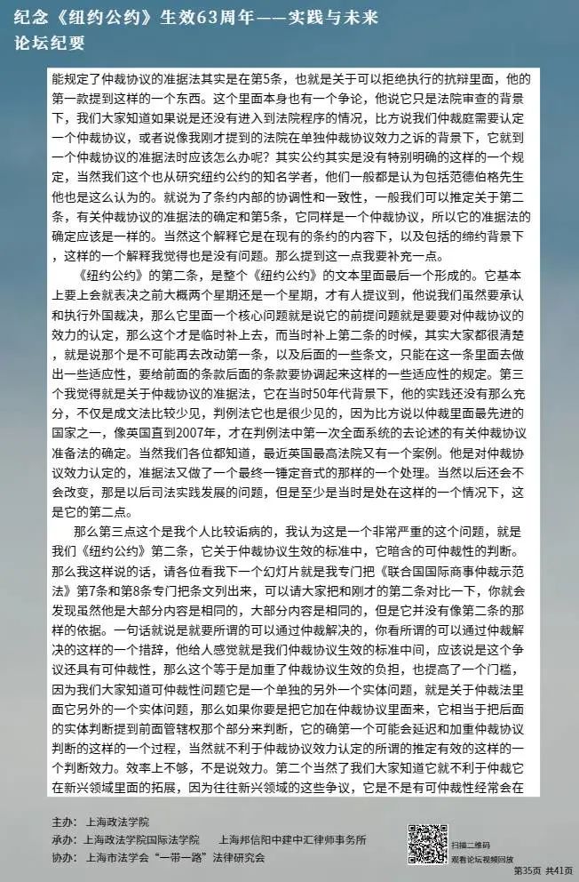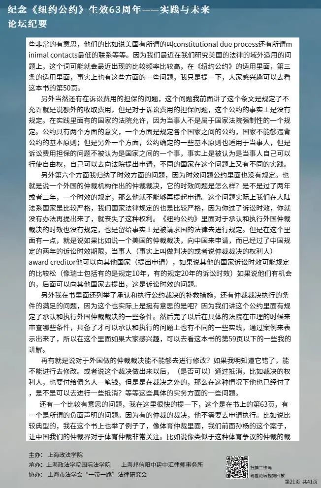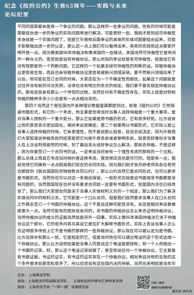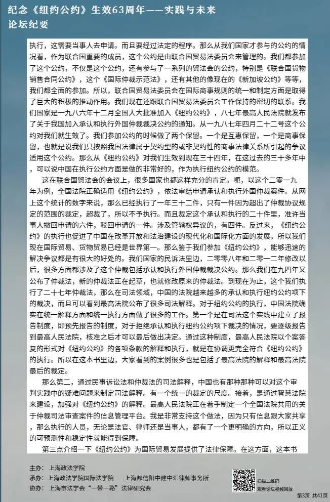 本次论坛集中国内知名专家学者的智慧,就《纽约公约》的实践与未来进行学术探讨,围绕《纽约公约》在中国的实践、拒绝承认与执行仲裁裁决的理由、仲裁协议的效力等问题分享真知灼见,有利于加强我国知名专家学者的互动交流,促进一系列重大国际法理论与实践问题的深入探讨,为国际商事仲裁的发展贡献中国智慧。