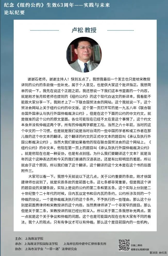 外交学院教授,中国国际私法研究会副会长,中国国际贸易促进委员会、中国国际商会调解中心副主席卢松就“《纽约公约》关键条款评述”展开讨论。首先,他简单介绍了《纽约公约》的第二条和第五条,同时表示该条款为《纽约公约》的重要条款。其次,他认为仲裁存在的前提为存在争议,目前国内存在仲裁机构允许当事人达成和解协议后再进行仲裁程序、进而形成仲裁裁决的现象,这与第二条的内容是相违背的。最后,他表示,《纽约公约》第五条的七项理由具有穷尽性,虽然在实务中会存在一些例外情况,但在适用公约时应当在条文的范围内适用。