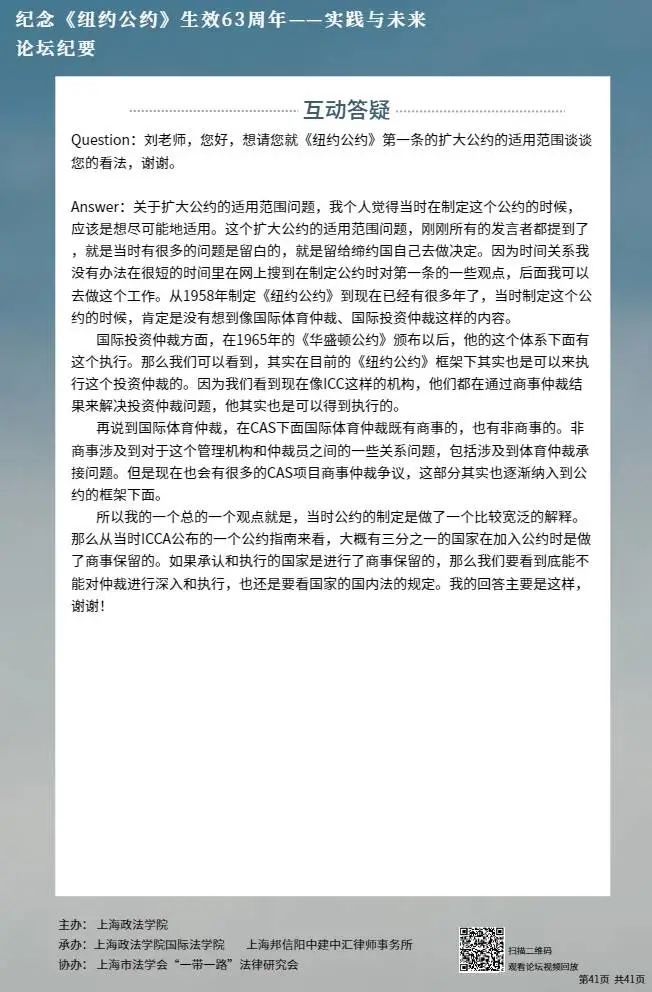 互动环节中,各位嘉宾就“纽约公约如此成功的真正原因到底是什么”、“如何理解仅约定合同适用的法律”等问题展开讨论,刘晓红进行总结回答。