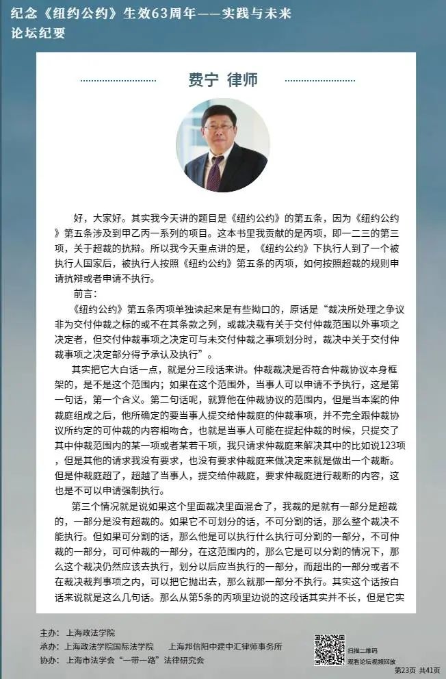 汇仲律师事务所执行合伙人、中国国际经济贸易仲裁委员、巴黎工商会以及新加坡国际仲裁中心仲裁员、香港国际仲裁中心理事会成员费宁就“拒绝承认与执行裁决的理由之超裁抗辩”展开讨论。首先,他以“超裁”为切入点,分析了《纽约公约》第五条第一款(丙)项的具体内涵。其次,他具体分析了“仲裁协议的本身”和“提交仲裁的事项”两个问题,并对中国司法机关对于超裁的理解加以阐述。最后,他以“河北中兴案”、“Midea Air Conditioning Equipment Co Ltd v Tomado Consumer Goods Ltd[2017]SGHC 193”、“徐兴龙与跃洋公司申请撤销裁决案”三个案例进一步解释拒绝承认与执行裁决的理由之超裁抗辩,提出各司法机关对超裁的理解和态度存在差异。