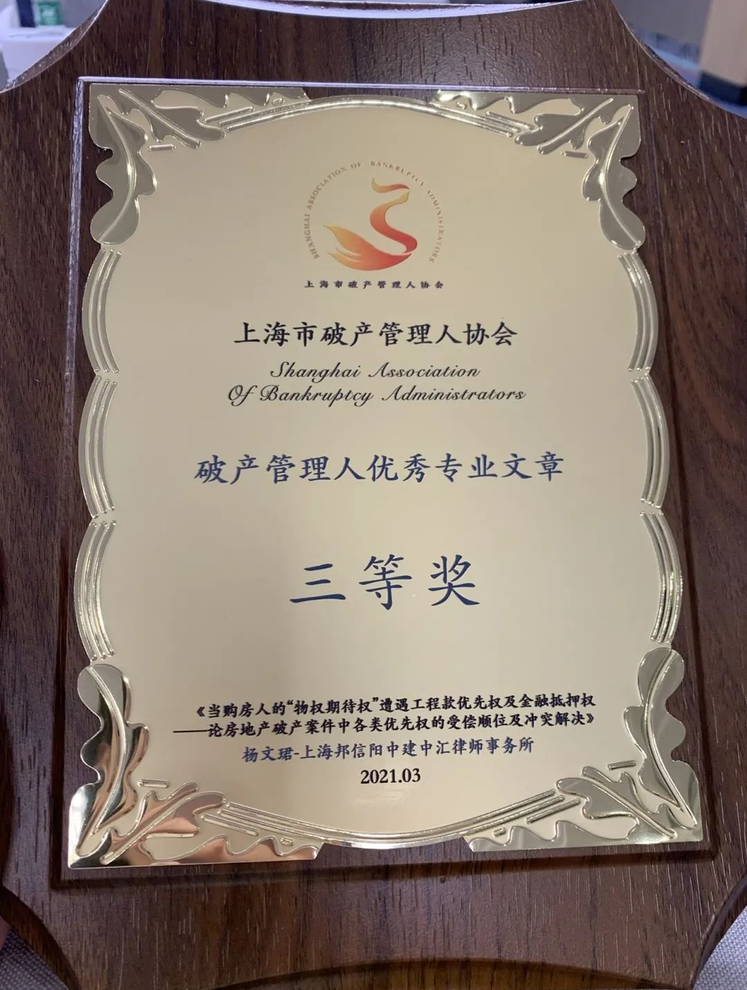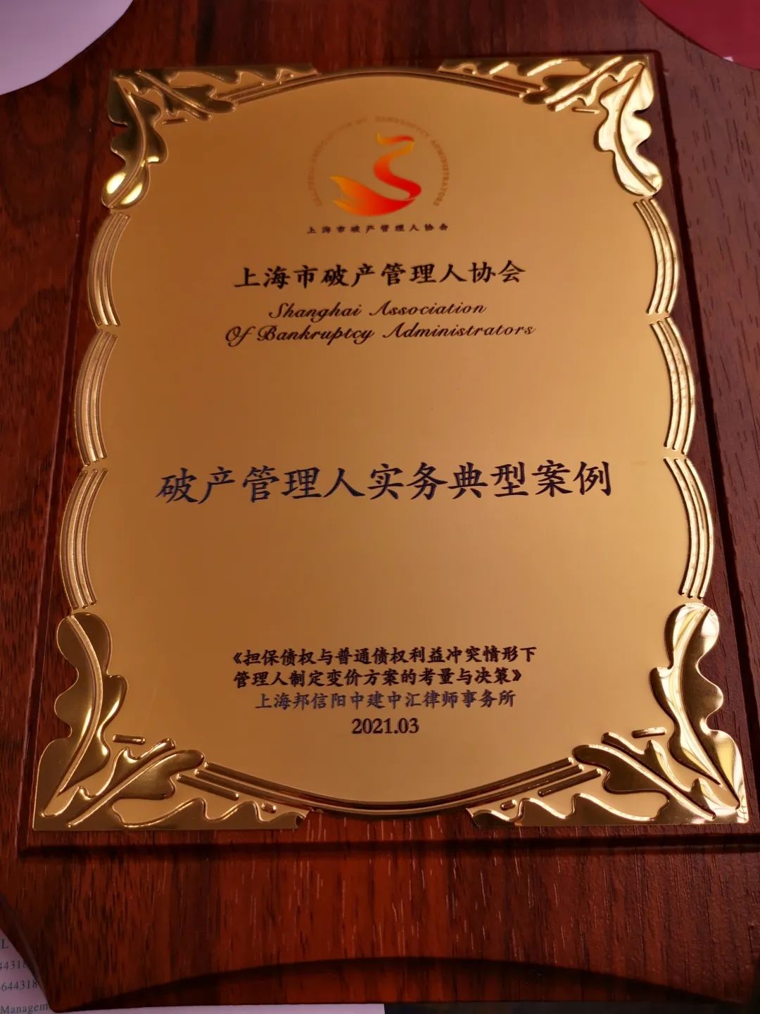 2020年,邦信阳中建中汇担任凯瑞富海实业投资有限公司破产清算一案的破产管理人,邦信阳中建中汇合伙人夏玲律师带领团队承办该案,并结合办案实践撰写《担保债权与普通债权利益冲突情形下管理人制定变价方案的考量与决策》一文。上海市破产管理人协会第一届会员大会第二次会议上,该案及文章被评为“破产管理人实务典型案例” 。邦信阳中建中汇合伙人杨文珺律师撰写的《当购房人的“物权期待权”遭遇工程款项优先权及金融抵押权——论房地产破产案件中各类优先权的受偿顺位及冲突解决》一文,荣获“破产管理人优秀专业文章”三等奖。