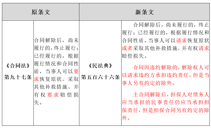 总体而言,《民法典》第566条关于合同解除效果的规定,系对既有规则的汇编整理,并未创设新的规则。同时,对于合同解除的溯及力问题、担保人的担保义务仅限于损害赔偿抑或包含恢复原状等其他类型义务的问题,有待未来司法实践予以明确。