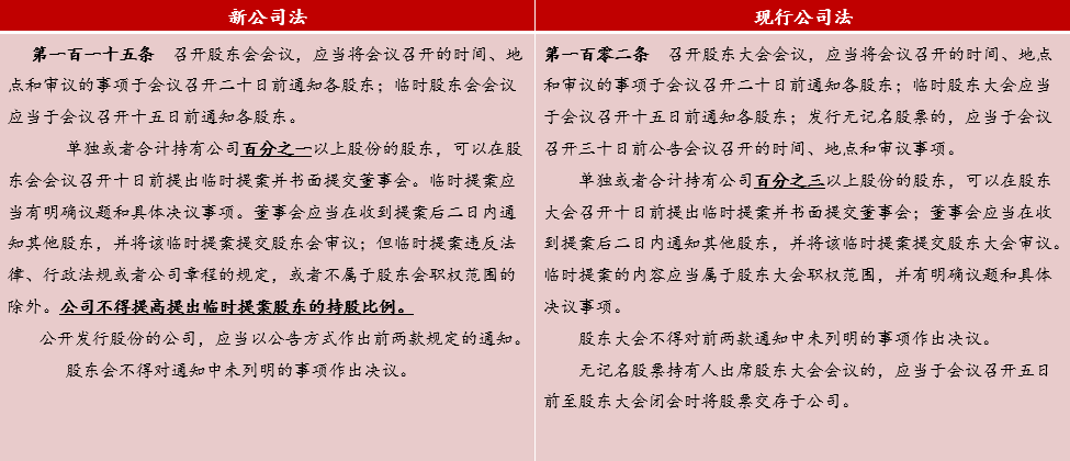 新公司法关于股东临时提案权修改最大的地方是,把原来临时提案股东的持股比例,由“百分之三”修改为“百分之一”,并且公司不得提高提出临时提案股东的持股比例,这有利于保障股东临时提案权的行使。