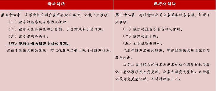 新公司法第56条相比原公司法第32条,对股东名册新增了记载事项“取得和丧失股东资格的日期”。