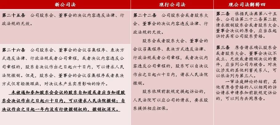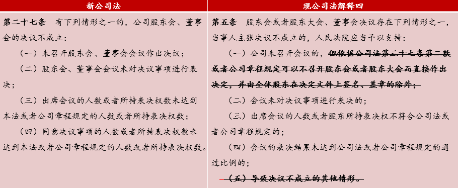 新公司法第27条,相比“现公司法解释四”第五条,删除了原来的第五项兜底性条款“导致决议不成立的其他情形”,明确列举了4种决议不成立的情形,这对于实务中解决到底是“决议撤销之诉”还是“决议不成立之诉”给出了明确的判断标准,有利于定纷止争。