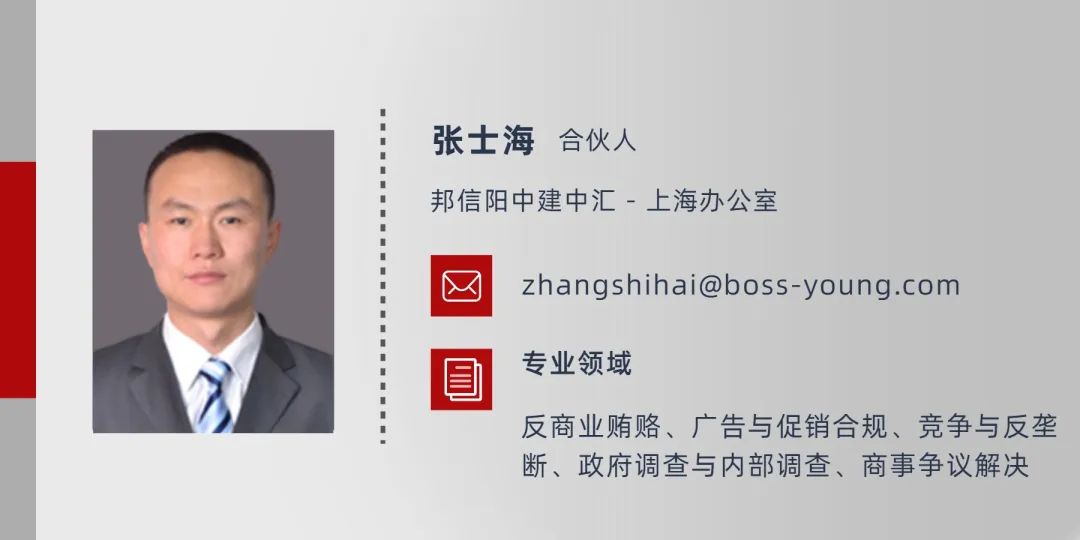 上海邦信阳中建中汇张士海律师团队主要从事合规业务,包括广告合规、促销合规、反不正当竞争(含反商业贿赂、商业混淆、虚假宣传、商业诋毁、商业秘密保护、不正当有奖销售等)、反垄断、电子商务、数据安全与隐私保护、消费者权益保护、政府关系、商标保护、白领犯罪等。
