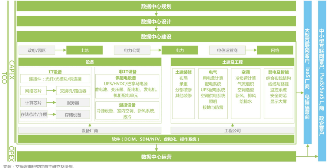 按照艾瑞咨询的分类,将算力中心按其生命周期可以分为规划、设计、建设和运营四个阶段。而建设阶段涉及面较广,包括立项、用地、用电、用水、用网、IT设备、非IT设备、土建及安装工程、软件系统等多个方面。