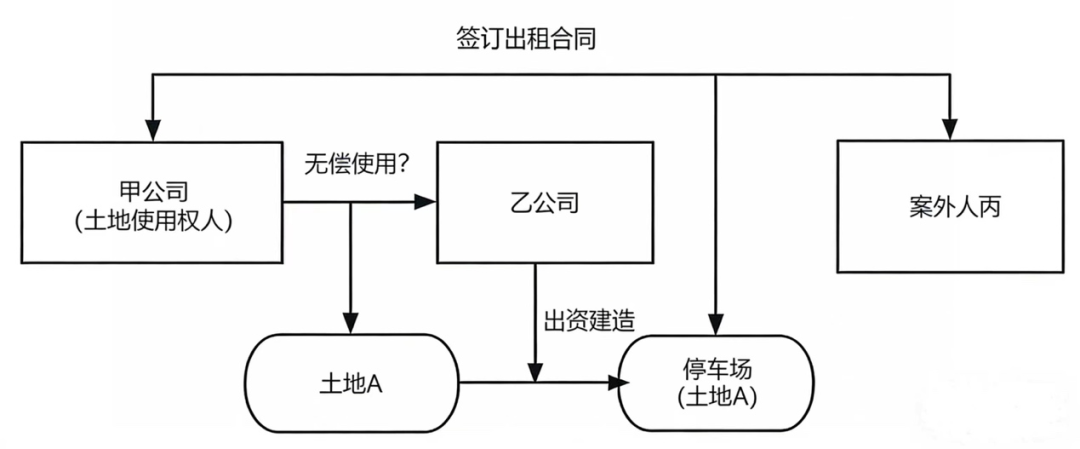 甲公司对土地A具有建设用地使用权,甲公司与乙公司共同的上级领导单位出具批示:乙公司可无偿使用土地A。乙公司为自己使用需要,对土地A进行水泥铺装、车位划线,形成地面停车场。停车场建造完成后长期空置,甲公司遂将停车场租赁于丙使用。