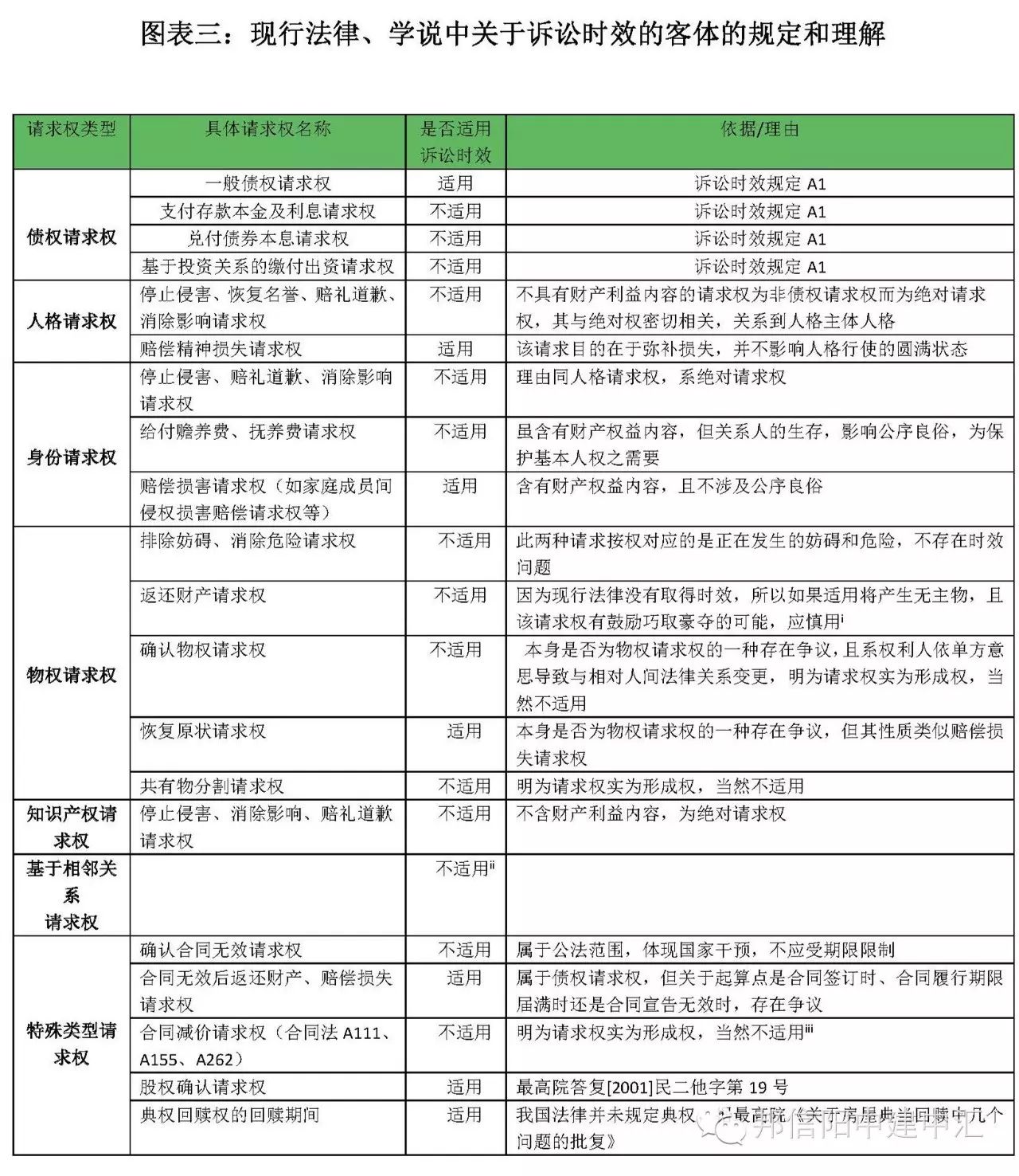 按照以上分类方法,就结合现行法律及本人所见的论著中各类权利适用诉讼时效问题的理解试作如下图表: