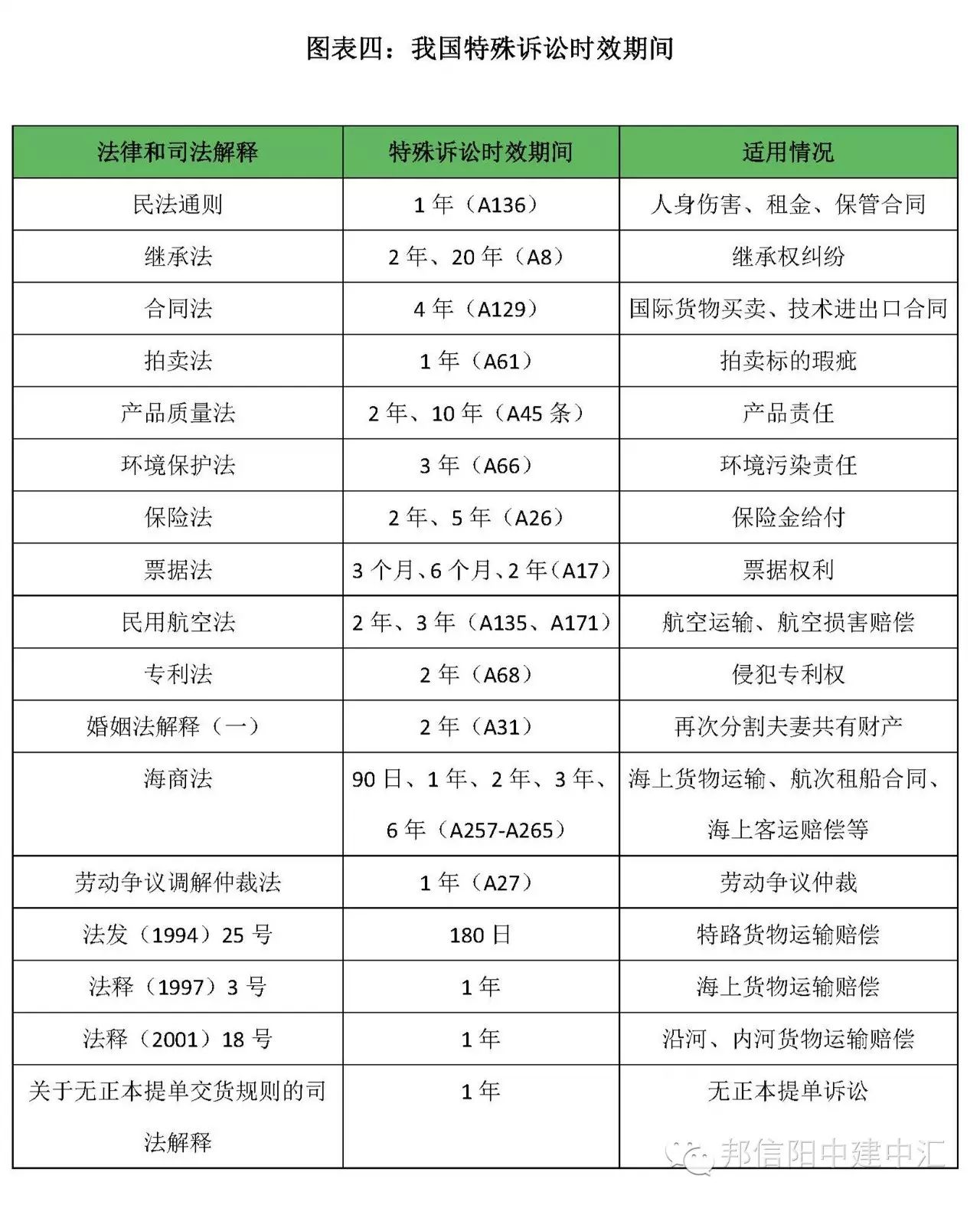 如前所述,我国特别法和司法解释中一共规定了10种长短不一的诉讼时效期间,根据学者整理,特摘录如下[36]: