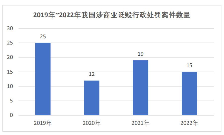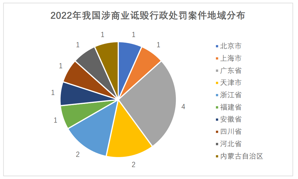 行政处罚方面,通过检索中国市场监管行政处罚文书网、部分地方市场监管局行政处罚公示信息、威科先行、北大法宝数据库,截至发稿之日,检索到近4年商业诋毁行政处罚共计61例,其中2019年25例、2020年12例、2021年19例,2022年15例。在2022年的相关行政处罚中,有11例位于我国东部经济发达地区,其中北京市1例、上海市1例,广东省4例、天津市2例、浙江省2例、福建省1例。