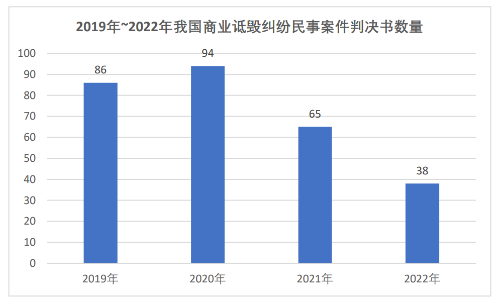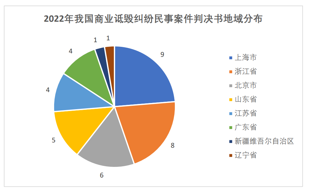 司法裁判方面,2019年~2022年,我国商业诋毁纠纷民事案件判决书共计283份,其中2019年86份、2020年94份、2021年65份,2022年38份。这38份判决书中,北京市6份(含最高人民法院1份)、上海市9份、广东省4份、浙江省8例、江苏省4例。