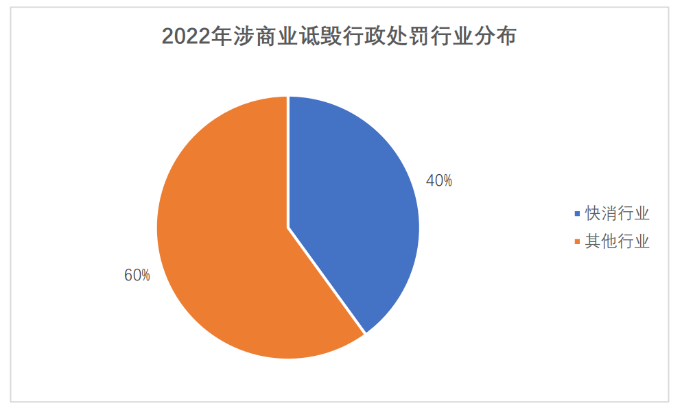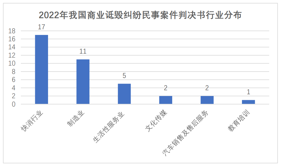 行业分布方面,商业诋毁案例高发于快消行业(Fast Moving Consumer Goods, FMCG)。2022年的15例行政处罚中,共有6例涉及快消行业(包括食品、化妆品、母婴用品、服装首饰)。上述38份2022年涉《反不正当竞争法》第十一条的商业诋毁民事纠纷判决书中,涉快消行业的共计17份。另有11份涉及制造业、5份涉及生活性服务业。