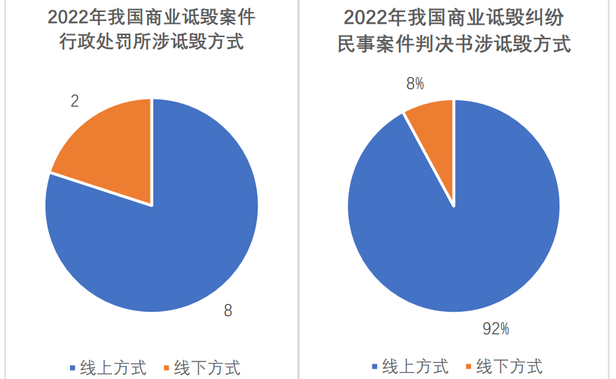 2022年的15例行政处罚中,共有10例述及了商业诋毁的方式,其中有8例发生在线上。在这8例违法线上宣传中,有4例涉及抖音、快手等平台的直播、短视频宣传。2022年的38例涉《反不正当竞争法》第十一条商业诋毁民事纠纷司法裁判中,有35例涉及线上宣传或线上利用互联网平台发布商业诋毁信息。