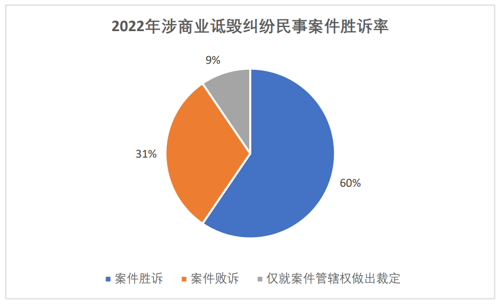 6. 司法案件胜诉率方面,截止发稿前,2022年我国涉商业诋毁民事案件共计42起,其中商业诋毁纠纷民事案件判决书共计38份,裁定书共计4份。上述判决书和裁定书中,有25起案件胜诉,13起案件败诉,另有4起仅就案件管辖权做出裁定。胜诉率为60%。