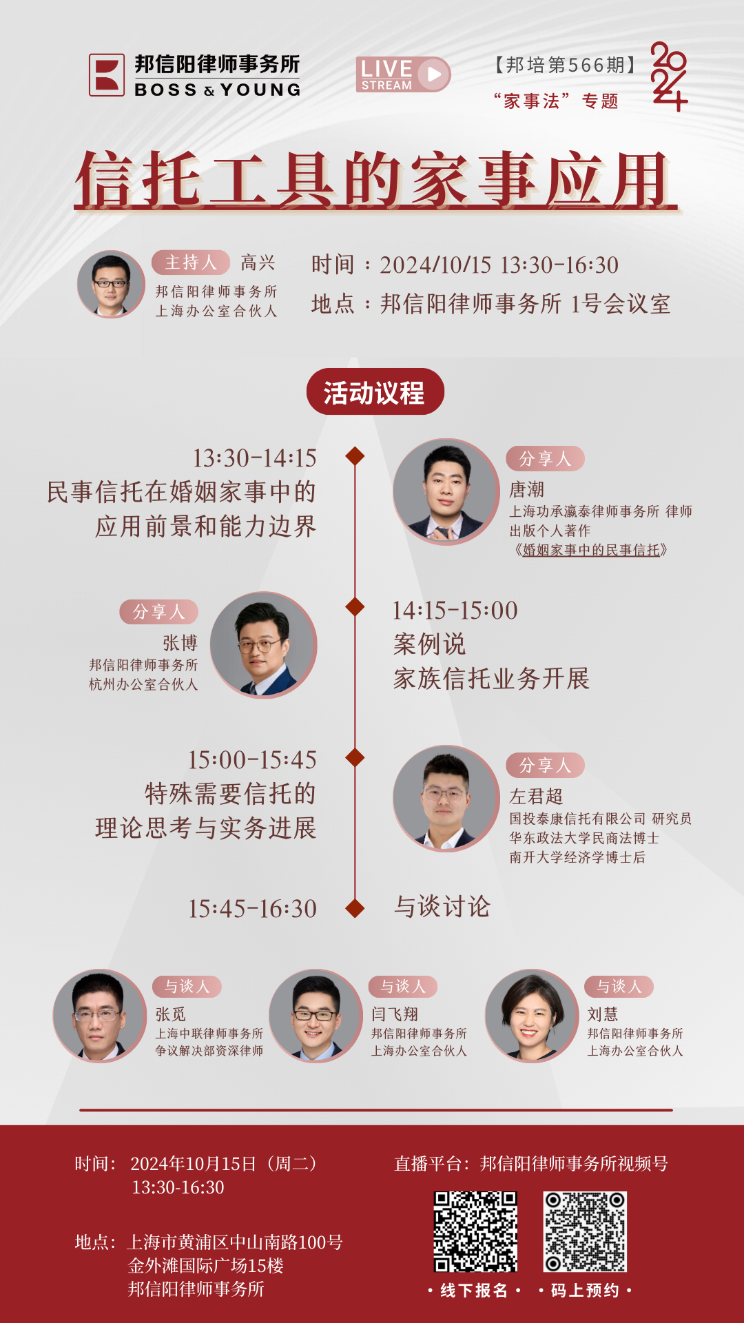 【邦培第566期:信托工具的家事应用】10月15日下午13:30在邦信阳上海办公室线下举行,活动将在邦信阳律师事务视频号同步直播,欢迎扫码预约。