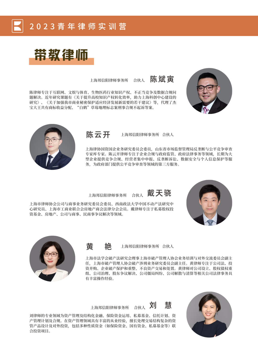2023年青年律师实训营为期三个月,设有实务类课程,对于刚刚开启律师职业生涯的青年律师,我们会根据其执业专业方向,配备资深的带教律师,并安排其进入相应的专业团队开展实务工作训练。实训营还设置有通识技能培训以及丰富多彩的文体活动,帮助青年律师融入邦信阳律师大家庭,助力其快速成长。