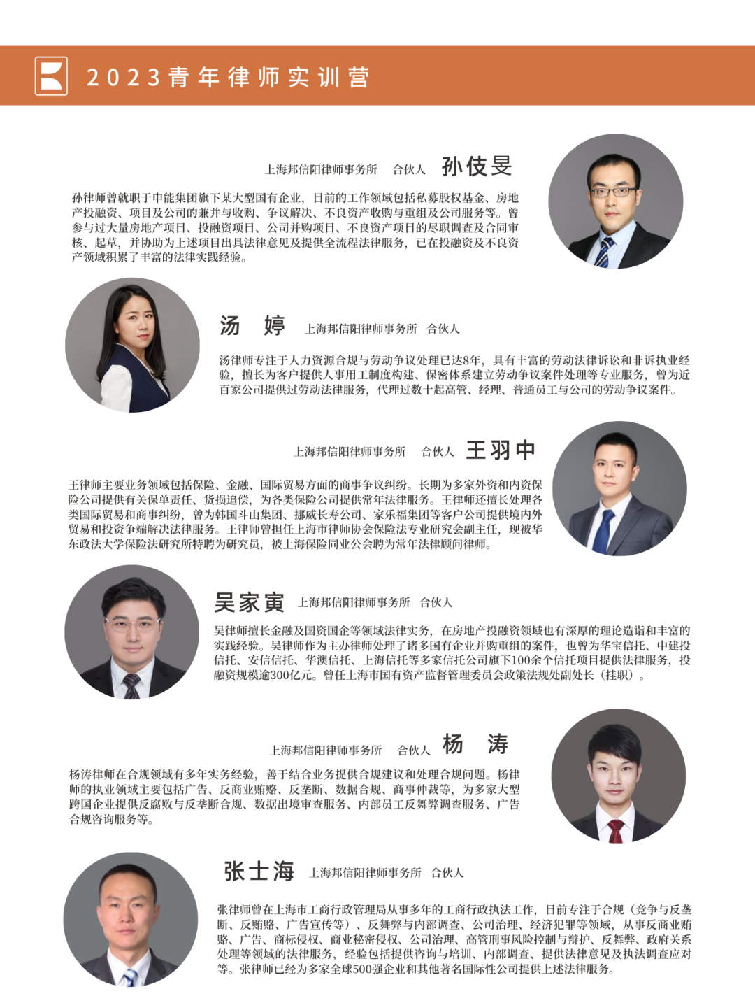目前邦信阳总部位于上海,目前已在北京、南京、武汉、杭州、宁波、西安、厦门、郑州、临港等10个城市/地区设立办公室。青年律师实训营面向邦信阳全国青年律师开放,旨在使加入邦信阳的青年律师们获得系统的、高质量的职业训练。
