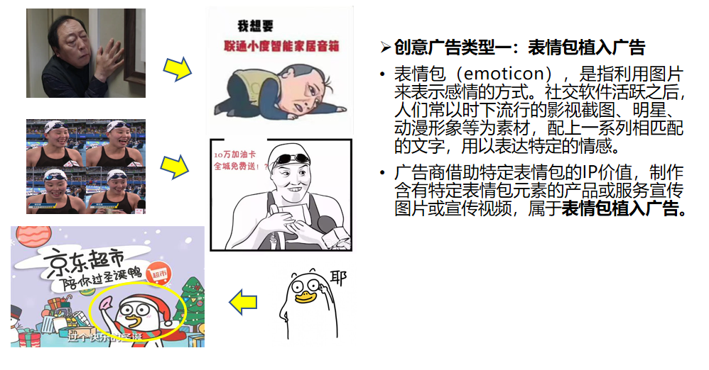 现代人喜欢通过给图片、动漫形象配上文字来表达特定的情感。在微信聊天或者其他的即时聊天工具里,大家都非常喜欢用表情包这种方式来表达自己的一种心情态度。借用表情包这种交流模式,通过特定表情包的制作,将自己的产品或者服务植入到这些表情包里面,就是表情包植入广告。它非常受人民群众欢迎,也非常生动,更容易打动年轻人。对于表情包植入广告,要注意两点:第一,表情包植入广告依然是广告;第二,需要特别注意包括著作权、肖像权等在内的法律风险。