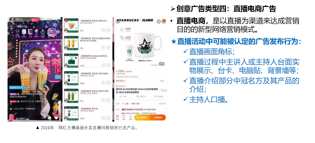 在这些直播活动中,有很多的广告形式,主要包括:图标、背景、台卡、电脑贴,直播口播介绍,等等。最高人民法院关于互联网网络销售的新司法解释,《最高人民法院关于审理网络消费纠纷案件适用法律若干问题的规定(一)》中,以及公布的相关案例中,都将主持人口播认定成广告。甚至,又更进一步:不认定构成要约邀请,而认定构成要约。即:如果口播能够清楚地表达销售产品的主要类型、种类、价格、交付使用条件等合同要素,甚至可以被认定为要约,而不仅仅是广告(要约邀请)。无论如何,大多数直播活动中,还是有非常多的广告元素。