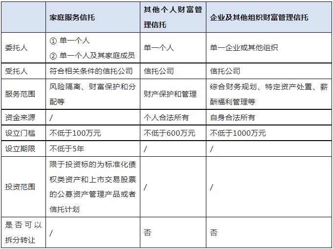值得注意的是,《信托业务分类新规》特别增加了“家庭服务信托”,并将“其他财富管理信托”根据委托人类型及其信托目的不同分为了“其他个人财富管理信托”和“企业及其他组织财富管理信托”,并划定了不同设立门槛。