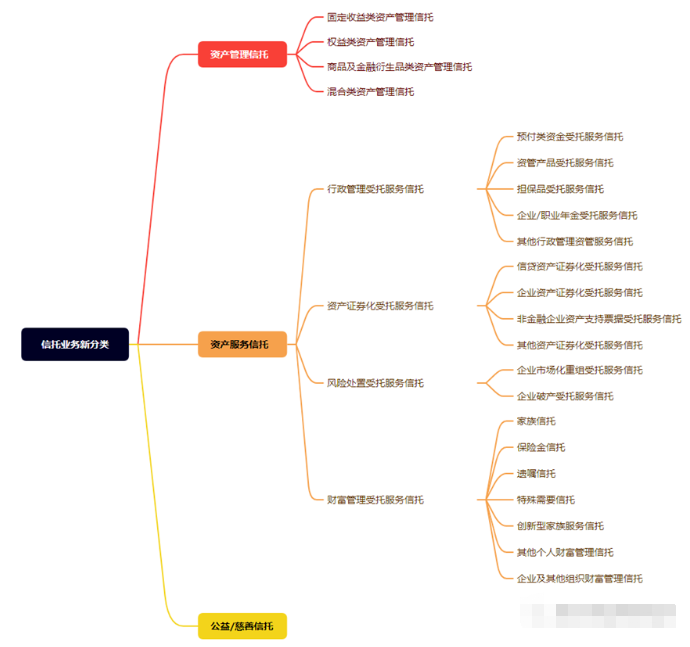 《信托业务分类新规》将信托业务划分为资产管理信托、资产服务信托和公益/慈善信托三大类别,并要求信托公司按信托服务实质对信托业务进行全面、准确分类。