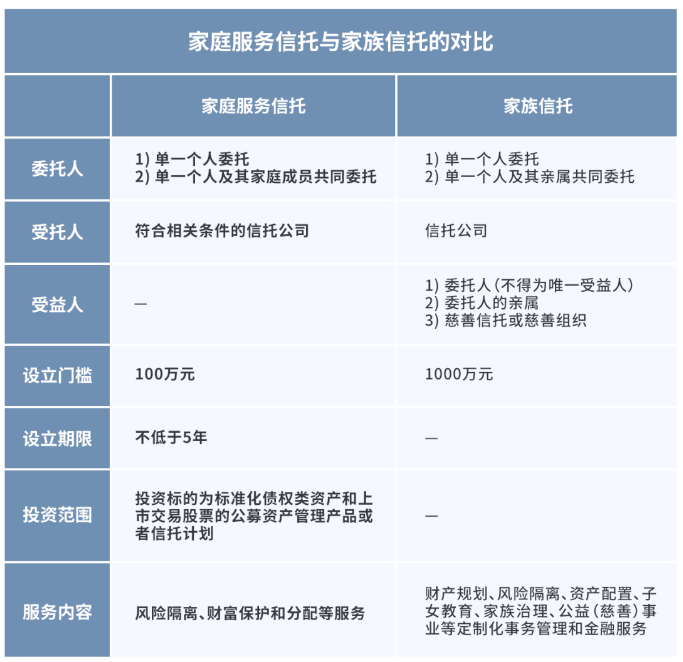较之家族信托而言,家庭服务信托扩大了委托人的范围、明确了受托人需要符合相关条件、降低了设立门槛、规定了设立期限并限制了投资范围。