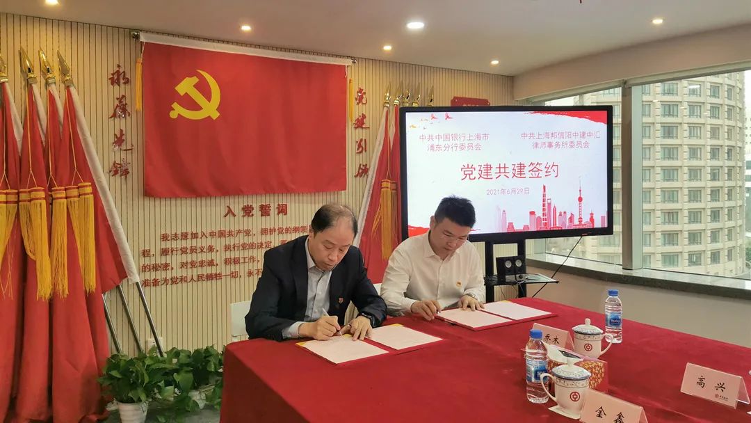 2021年6月29日,中共上海邦信阳中建中汇律师事务所委员会与中共中国银行上海市浦东分行委员会党建共建签约仪式在中行浦东分行华都大厦10楼会议室举行。中行浦东分行党委书记、行长刘连军,党委委员、副行长仇一尘,党委委员、副行长李哲,邦信阳中建中汇党委书记赵亮波、党委副书记王家德、戴天骁及双方党委班子其他成员、党员代表等20余人出席签约仪式。