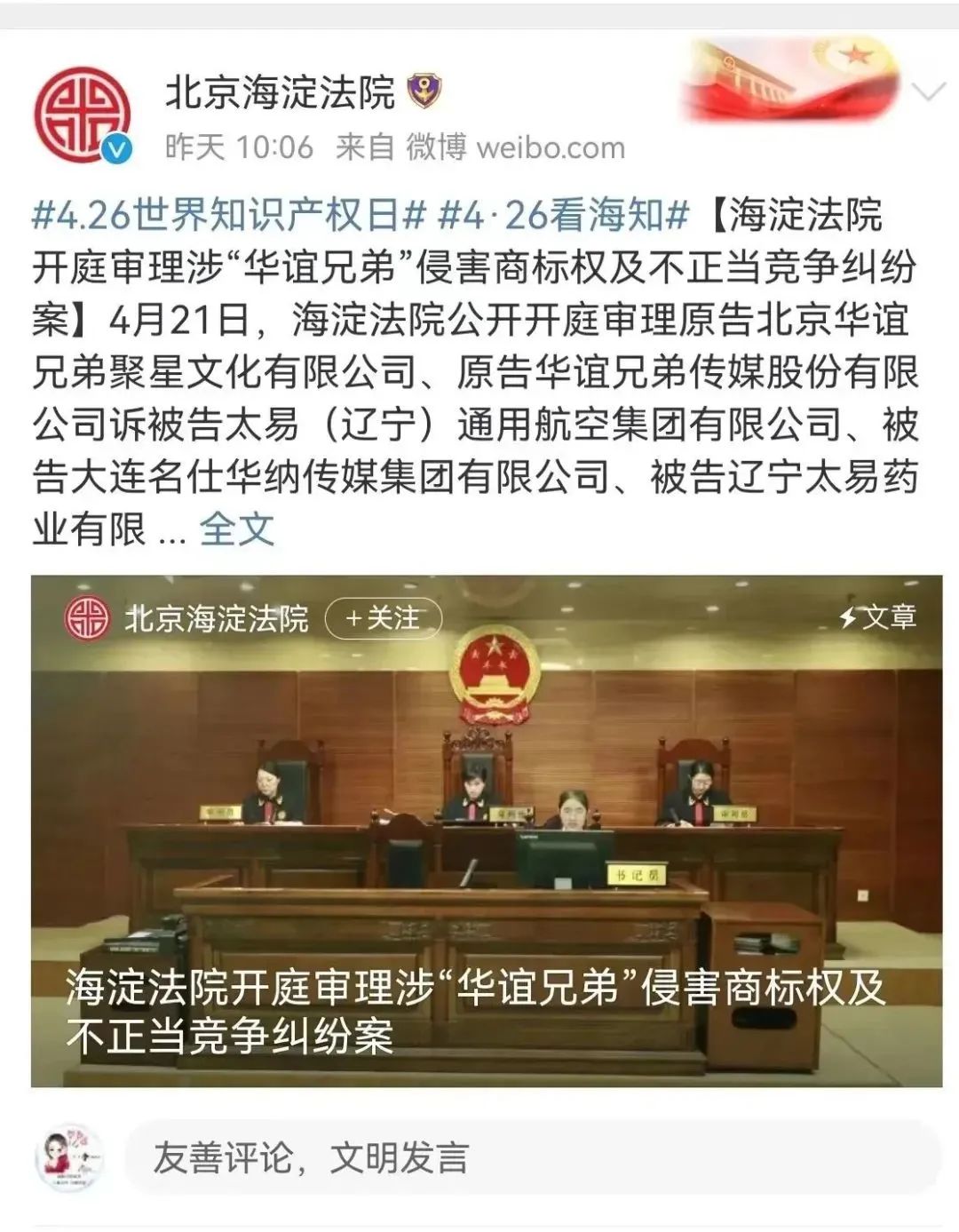 2023年4月26日是世界知识产权日,北京海淀法院在其新浪微博账号上以“4.26世界知识产权日”“4.26看海知”为话题发表文章,标题为海淀法院开庭审理涉“华谊兄弟”侵害商标权及不正当竞争纠纷案。