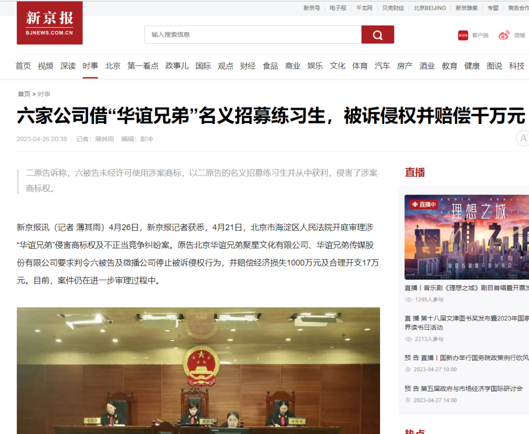 《新京报》也在世界知识产权日对本案进行了报道,标题为六家公司借“华谊兄弟”名义招募练习生,被诉侵权并赔偿千万元。