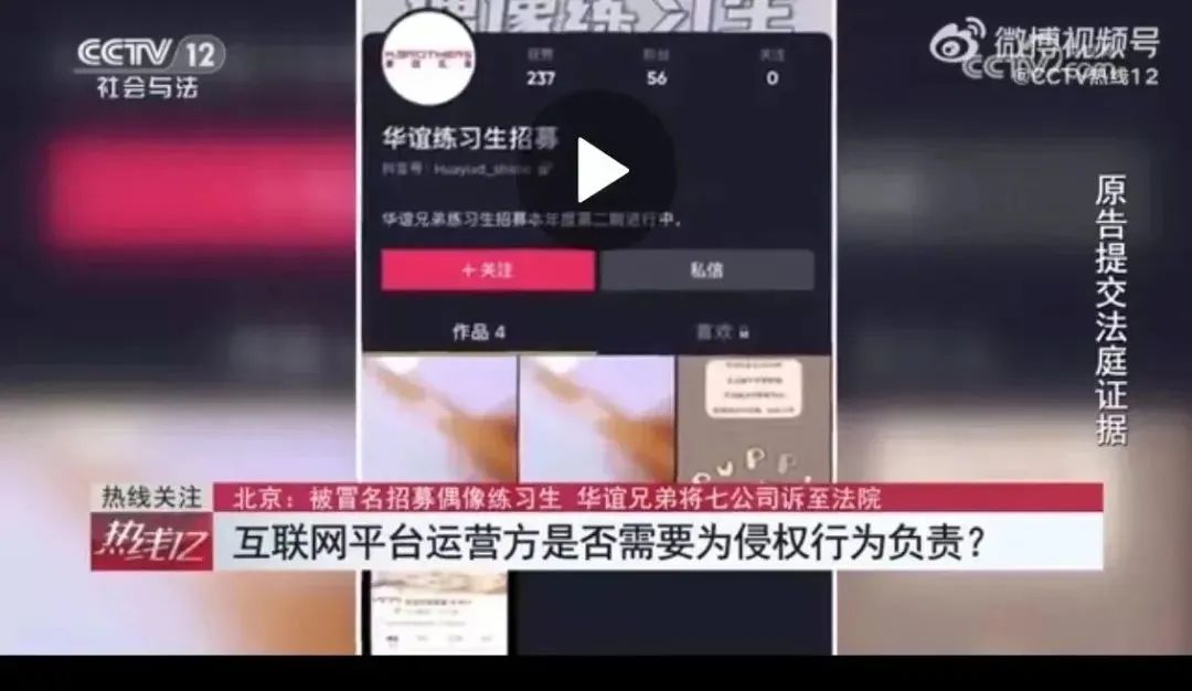 2023年4月26日,CCTV12社会与法电视台对本案进行报道,并在其新浪微博账号上发布庭审的部分录像,标题为“被冒名招募偶像练习生,华谊兄弟将七公司诉至法院”,该报道还提及到原告方代理人关于被告微播公司作为抖音平台的运营方,未尽到合理注意义务,构成帮助侵权的这一主张,提出“互联网平台运营方是否需要为侵权行为负责”这一问题。