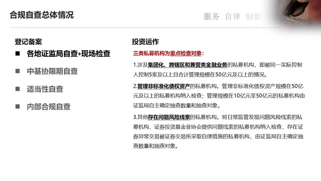 市场上的一些机构已经主动开展内部合规自查,整改完善内控体系。近日,团队的小伙伴又刚刚完成了一家知名私募股权投资基金管理人的系统性内部合规自查法律服务,并为客户提供了针对房地产私募基金管理人的合规自查培训。