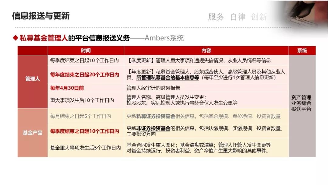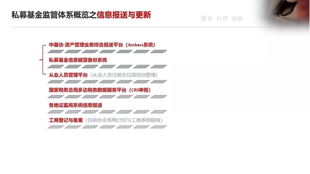 中基协-资产管理业务综合报送平台(Ambers系统)、私募基金信息披露备份系统、从业人员管理平台(从业人员注册登记);国家税务总局-多边税务数据服务平台(CRS申报);各地证监局系统信息报送;工商登记备案等。