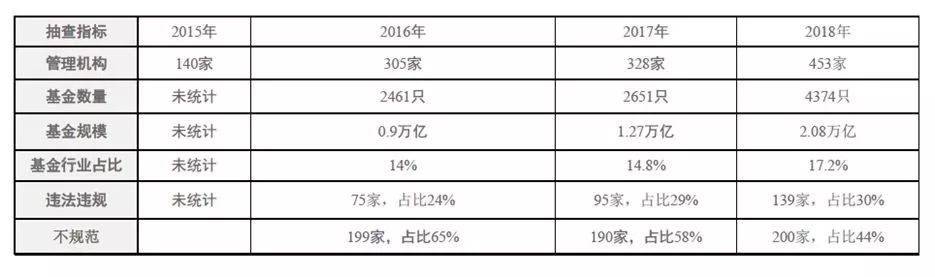 根据证监会通报的2018年私募基金专项检查执法情况,证监会在2018年上半年组织各地证监局对453家私募机构开展了专项检查,检查对象以“问题风险导向”和“随机抽取”方式选取,包括私募股权、创业投资基金管理人281家,私募证券基金管理人119家,其他类私募基金管理人53家。共涉及基金4374只,管理规模2.08万亿元,占行业总管理规模的17.20%。检查结果统计如下: