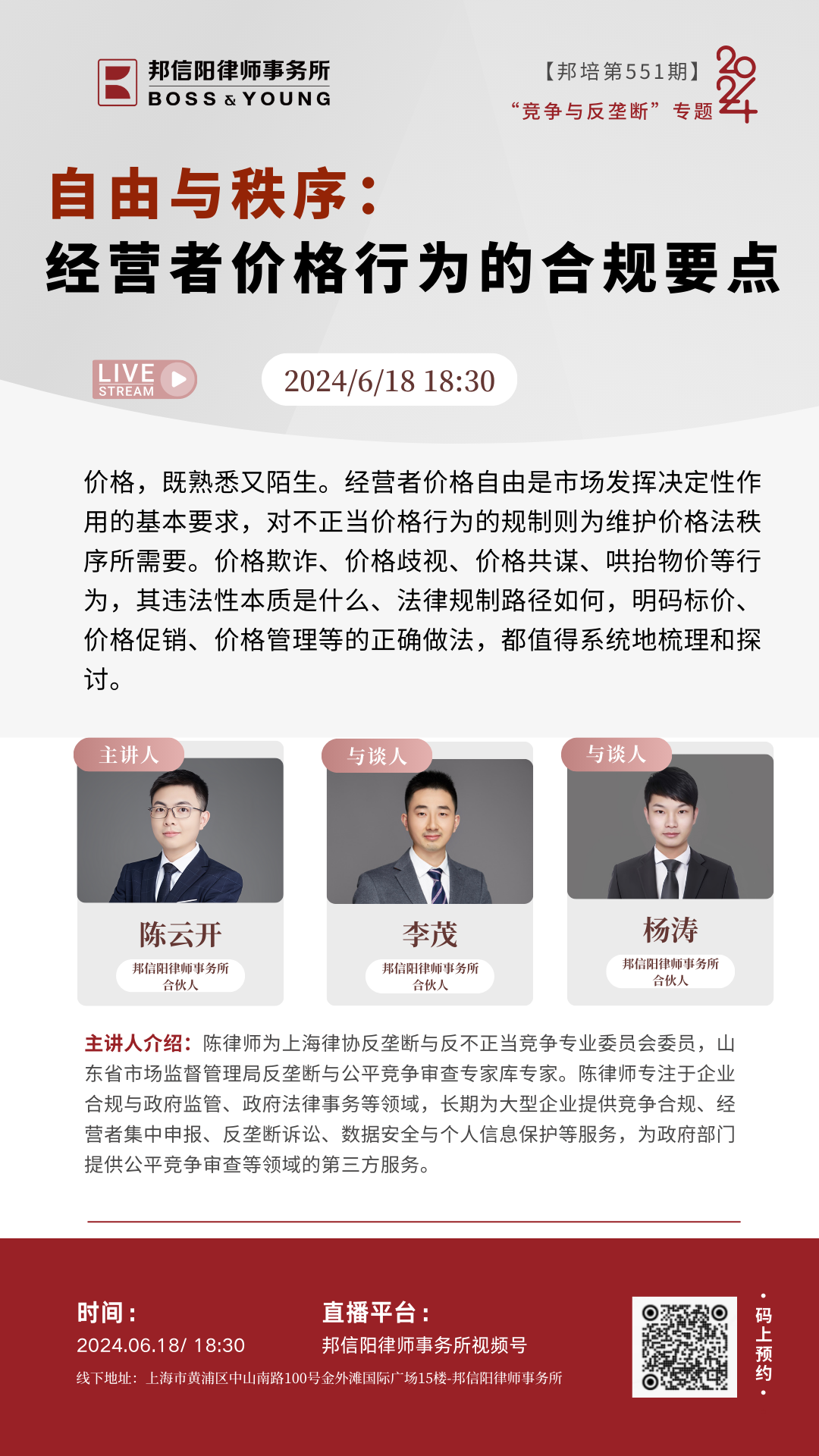 【邦培第551期:自由与秩序:经营者价格行为的合规要点】6月18日晚18:30在邦信阳律师事务所视频号直播。