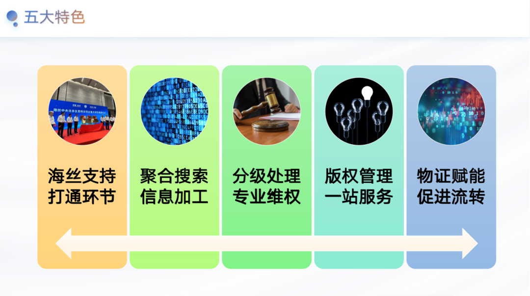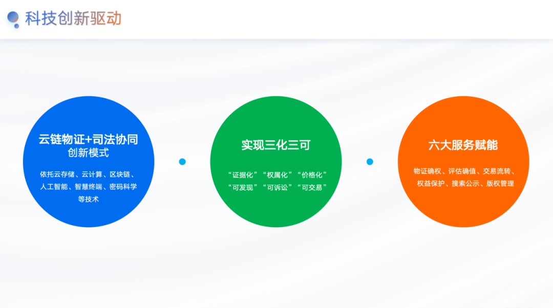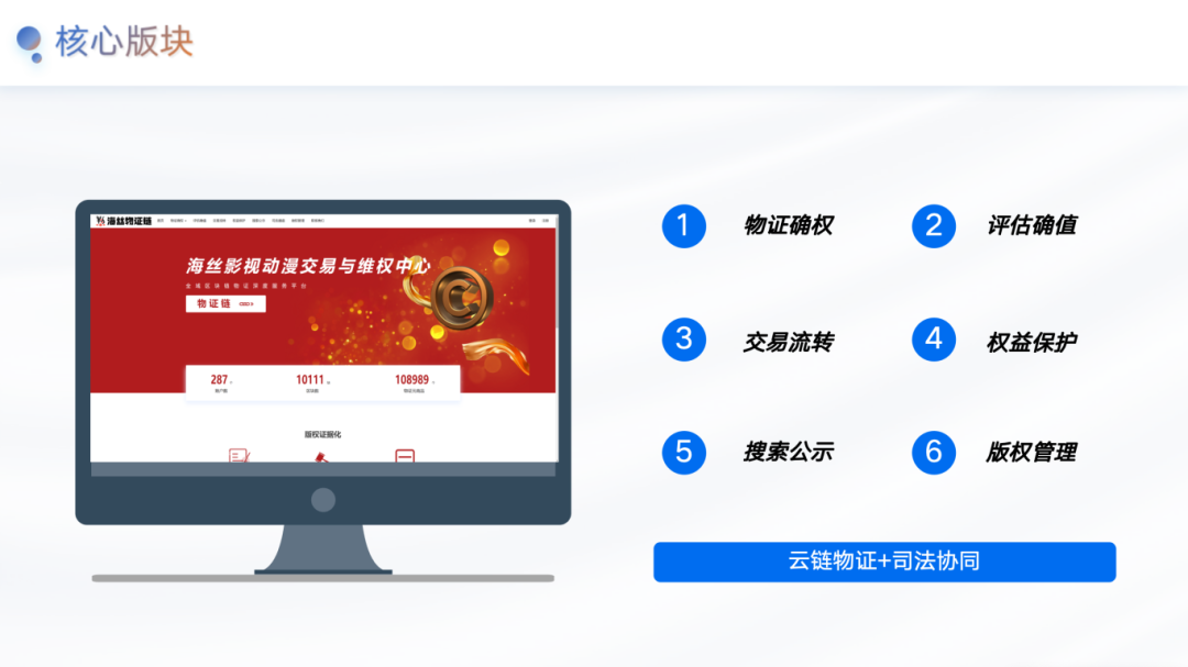 中心以科技创新驱动,首创“区块链+物证+司法协同”模式,依托区块链、云计算、人工智能、大数据、深度学习、历思多维物证等技术,实现自身“智慧物证”“价值评估”和“身份认证”三大优势技术的创新应用,提供影视文化资产的物证确权、评估确值、交易流转、权益保护、搜索公示、版权管理六大服务,在合规运营、安全流动的前提下,为影视资产持有方、发行平台方、数字资产使用方提供全套解决方案和一站式综合服务。