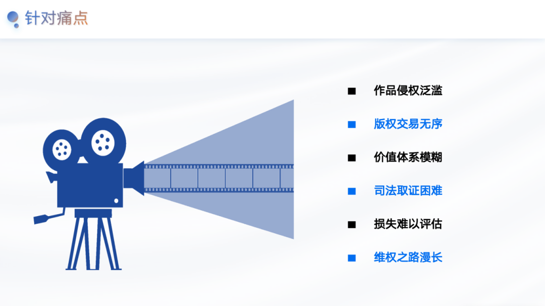 针对作品侵权现象泛滥、商事交易无序、价值体系模糊、司法取证困难、损失难以评估等影视文化行业痛点,从作品制作、发表、交易等多阶段多角度对作品、权利人进行保护,构建一站式、全链条、全方位的权利保护,从而助力影视文化产业数字化发展。