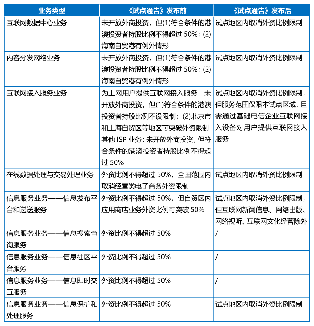 《通告》明确,将在北京市服务业扩大开放综合示范区、上海自由贸易试验区临港新片区及社会主义现代化建设引领区、海南自由贸易港、深圳中国特色社会主义先行示范区率先开展试点,取消互联网数据中心(IDC)、内容分发网络(CDN)、互联网接入服务(ISP)、在线数据处理与交易处理,以及信息服务中信息发布平台和递送服务(互联网新闻信息、网络出版、网络视听、互联网文化经营除外)、信息保护和处理服务业务的外资股比限制。
