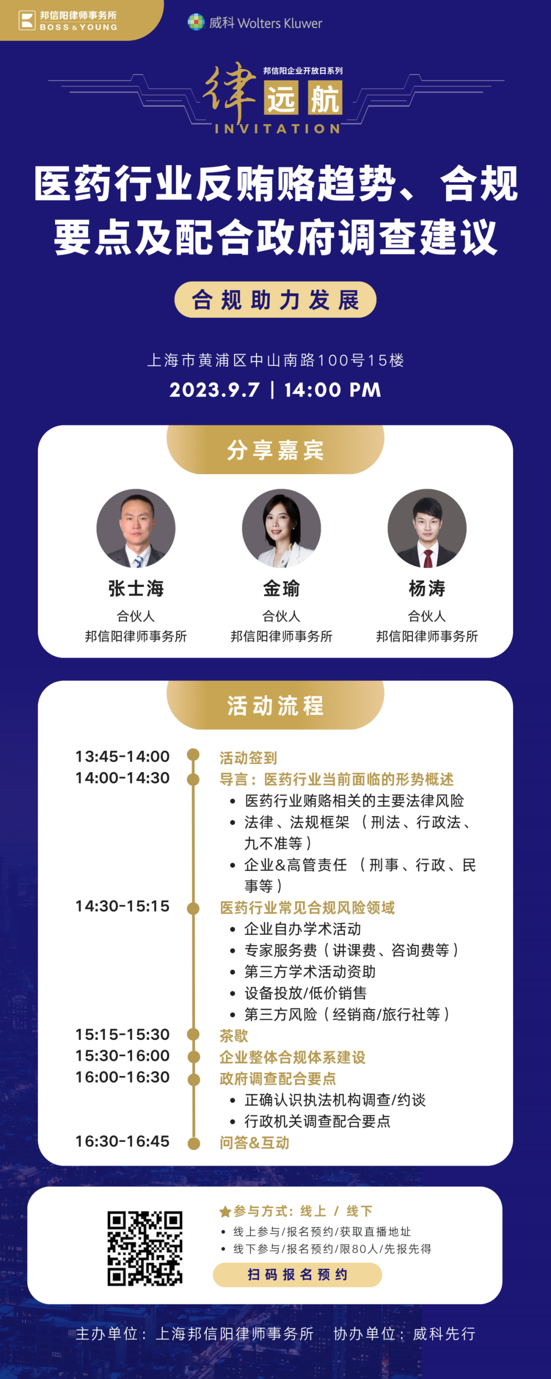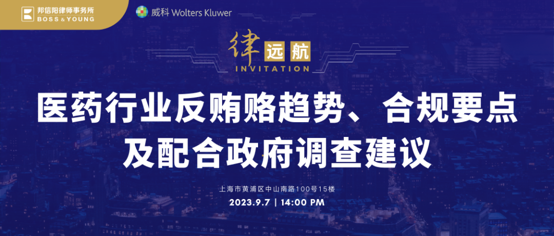 为回应业界对于本轮医药反腐行动的关切,帮助业界更好地理解本轮医药反腐行动的监管精神和监管要求,全面了解行业合规风险及合规发展路径,邦信阳律师事务所联合威科先行将于2023年9月7日下午 举办“律·远航”系列活动,本次活动主题为“医药行业反贿赂趋势、合规要点及配合政府调查建议”。