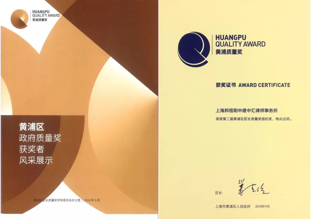 正是在这样的背景下,借事务所2014年合并发展的重大历史契机,邦信阳中建中汇创新性导入“卓越绩效模式”,并分别于2016年与2018年两度参与黄浦区区长质量奖的评审,并于2016年获得第一届黄浦区区长质量奖入围奖,于2018年获得第二届黄浦区区长质量奖。邦信阳中建中汇成为上海首家获此殊荣的律师事务所。