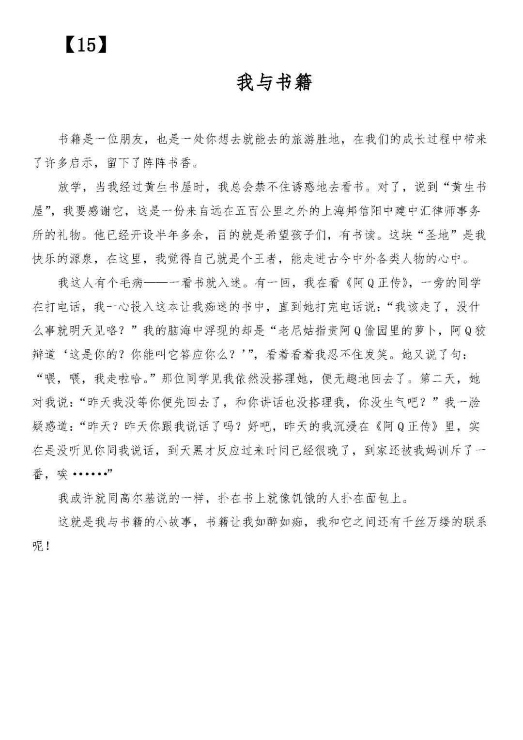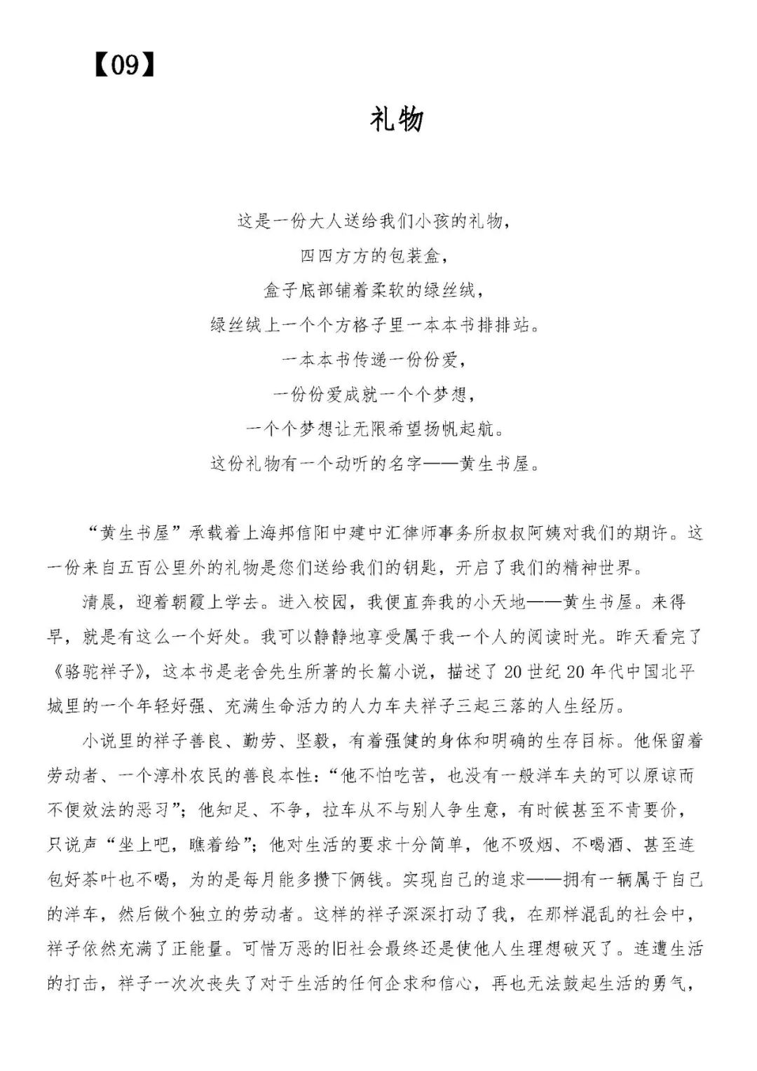 适逢邦信阳中建中汇律师事务所25周年庆,律所发起此次“阅读 悦读”读书征文活动,旨在给孩子们提供一个记录与展示的平台,记录下学生们与黄生书屋的美丽相遇,分享学生们在书屋内阅读的感受,感受学生们与经典故事的心灵与思维的碰撞,以及迸发出的奇思妙想……同时,邦信阳中建中汇将以此作为新的起点,在未来时刻牢记自己的社会责任,积极参与慈善事业,共同助力公益事业的发展,为更多孩子的梦想与未来助力。