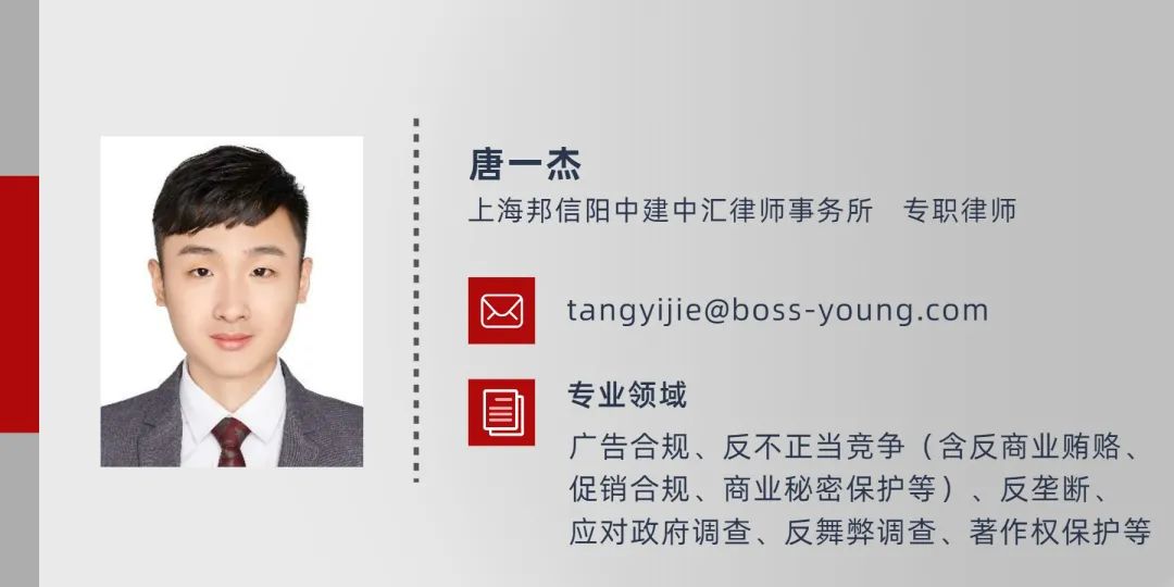 唐一杰律师,上海邦信阳中建中汇合规与政府监管团队成员,本文在张士海律师、杨涛律师的指导下完成。上海邦信阳中建中汇合规与政府监管团队由前政府市场监督管理部门执法官员、前公司法律与合规顾问、具有留学背景人员等律师构成。主要从事合规业务,包括广告合规、促销合规、反不正当竞争(含反商业贿赂、商业混淆、虚假宣传、商业诋毁、商业秘密保护、不正当有奖销售等)、反垄断、反舞弊、电子商务、数据安全与隐私保护、消费者权益保护、政府关系、商标保护、白领犯罪等。