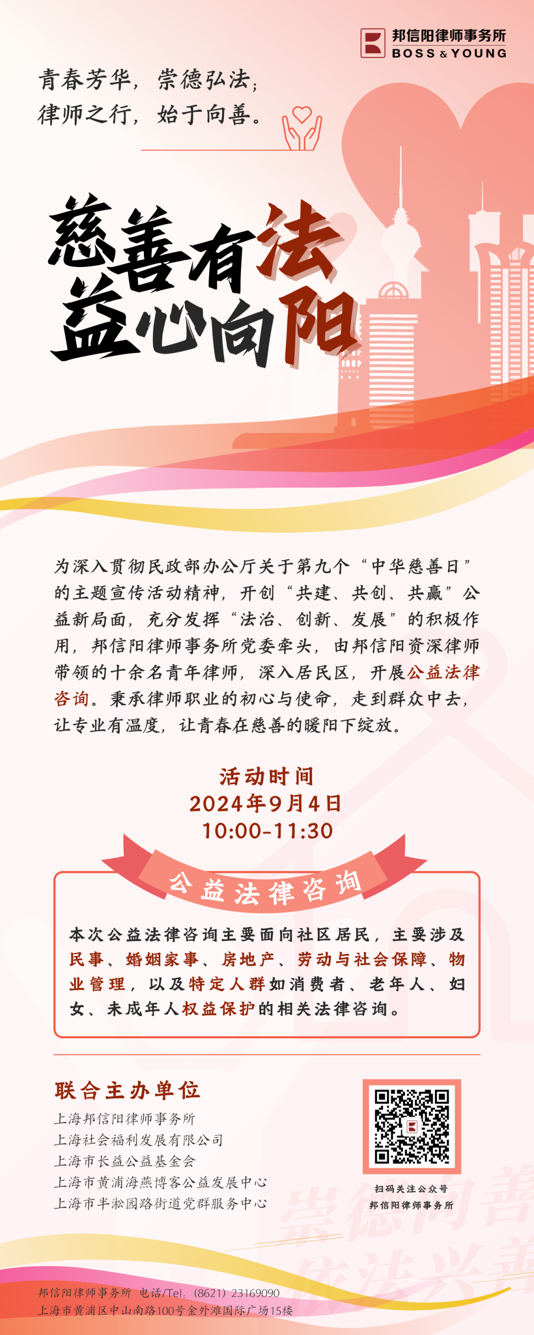 金秋九月,我们即将迎来第九个“中华慈善日”。9月4日,邦信阳律师事务所将携手上海社会福利发展有限公司、上海市长益公益基金会、上海市黄浦海燕博客公益发展中心以及上海市半淞园路街道党群服务中心,共同举办主题为“慈善有法 益心向阳”慈善公益活动。